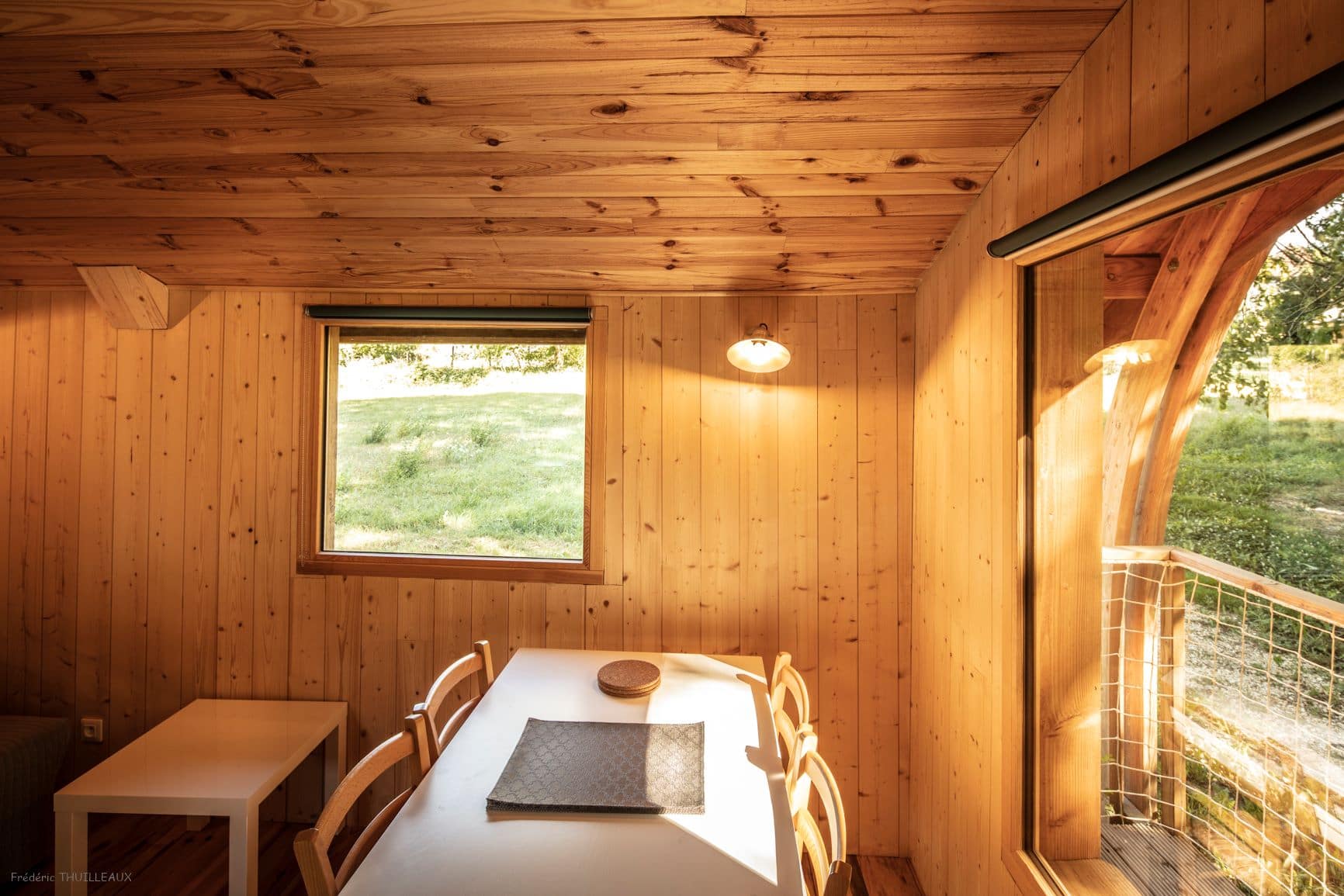 Nous avons fait le choix de construire nos écolodges entièrement en bois. C’est un matériau vivant qui a des imperfections, des nœuds, des différences de couleurs qui se transforment, bougent avec le temps et le degré d’humidité. Regardez bien les nœuds du plafond ou des murs et amusez-vous à reconnaître des formes d’animaux et les lambris issus du même tronc qui sont presque identiques !