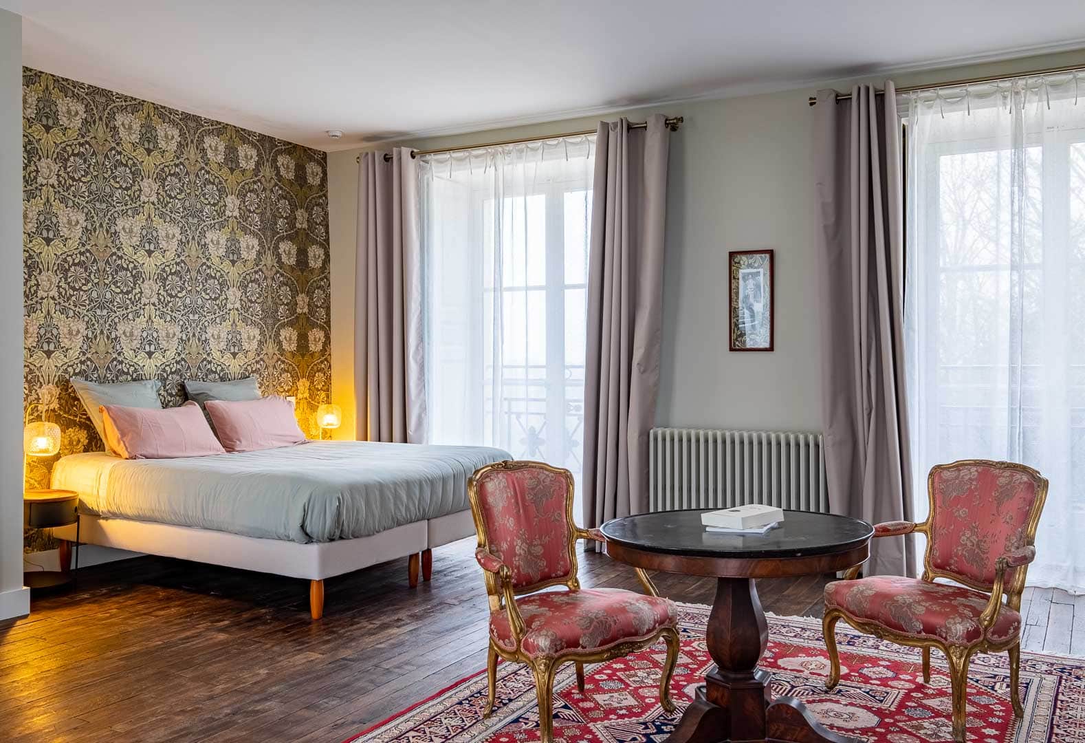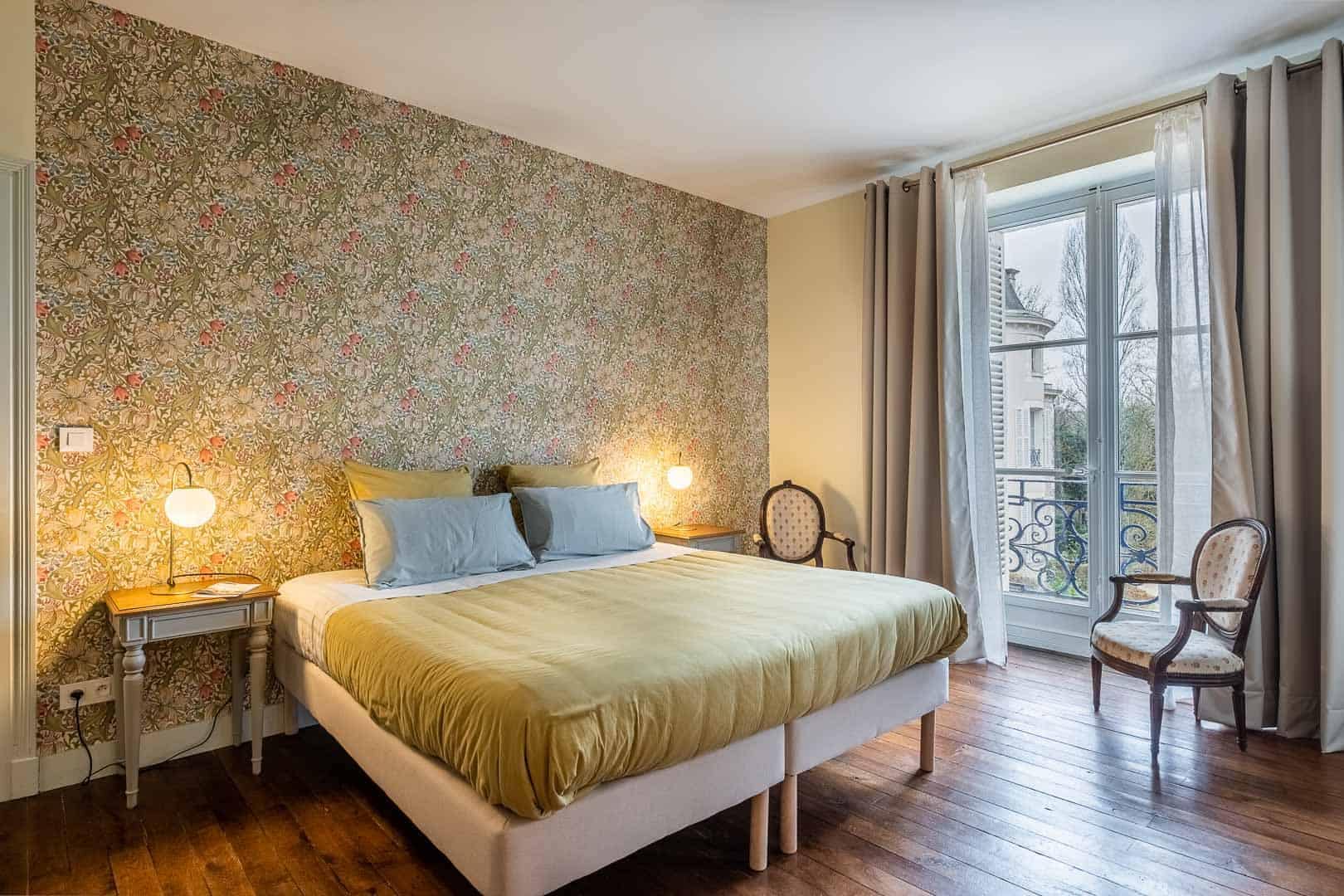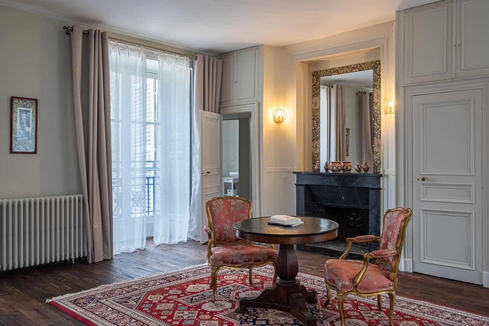 Chambre de 32 m2 pour 2 à3 personnes avec double orientation : une fenêtre, au Sud, ouvre sur le parc et ses deux magnolias ; de l’autre fenêtre, à l’est, vous apercevrez les belles granges. Elle dispose d’une salle de bain avec baignoire, douche et WC. Vous pouvez associer la chambre des Magnolias avec la chambre Robert de Montesquiou pour créer une grande suite pouvant accueillir jusqu’à six personnes.